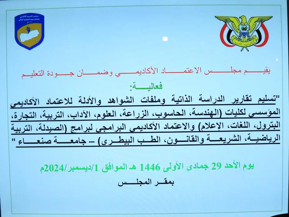 مجلس الاعتماد الأكاديمي يتسلم تقارير الدراسة الذاتية والأدلة للاعتماد المؤسسي لجامعة صنعاء 2024-12-01