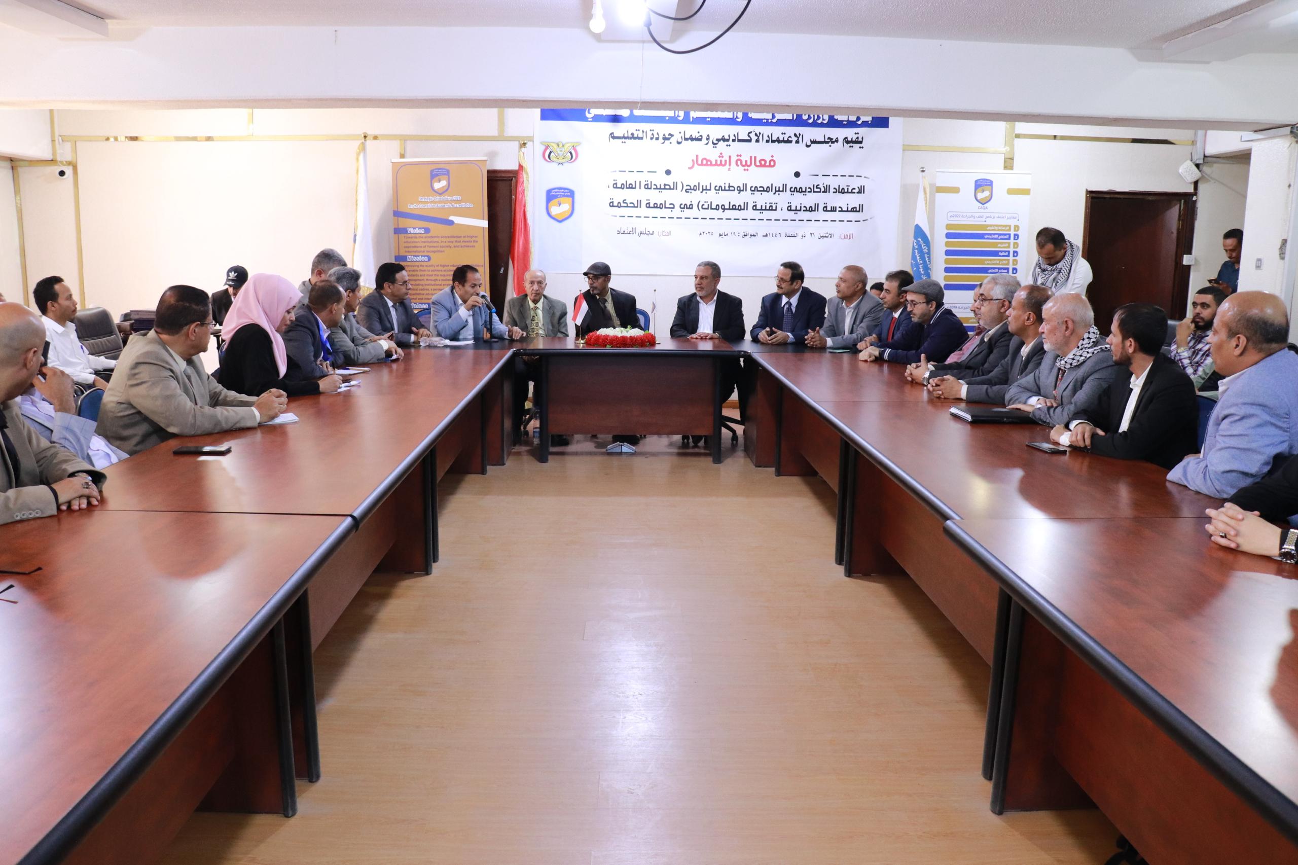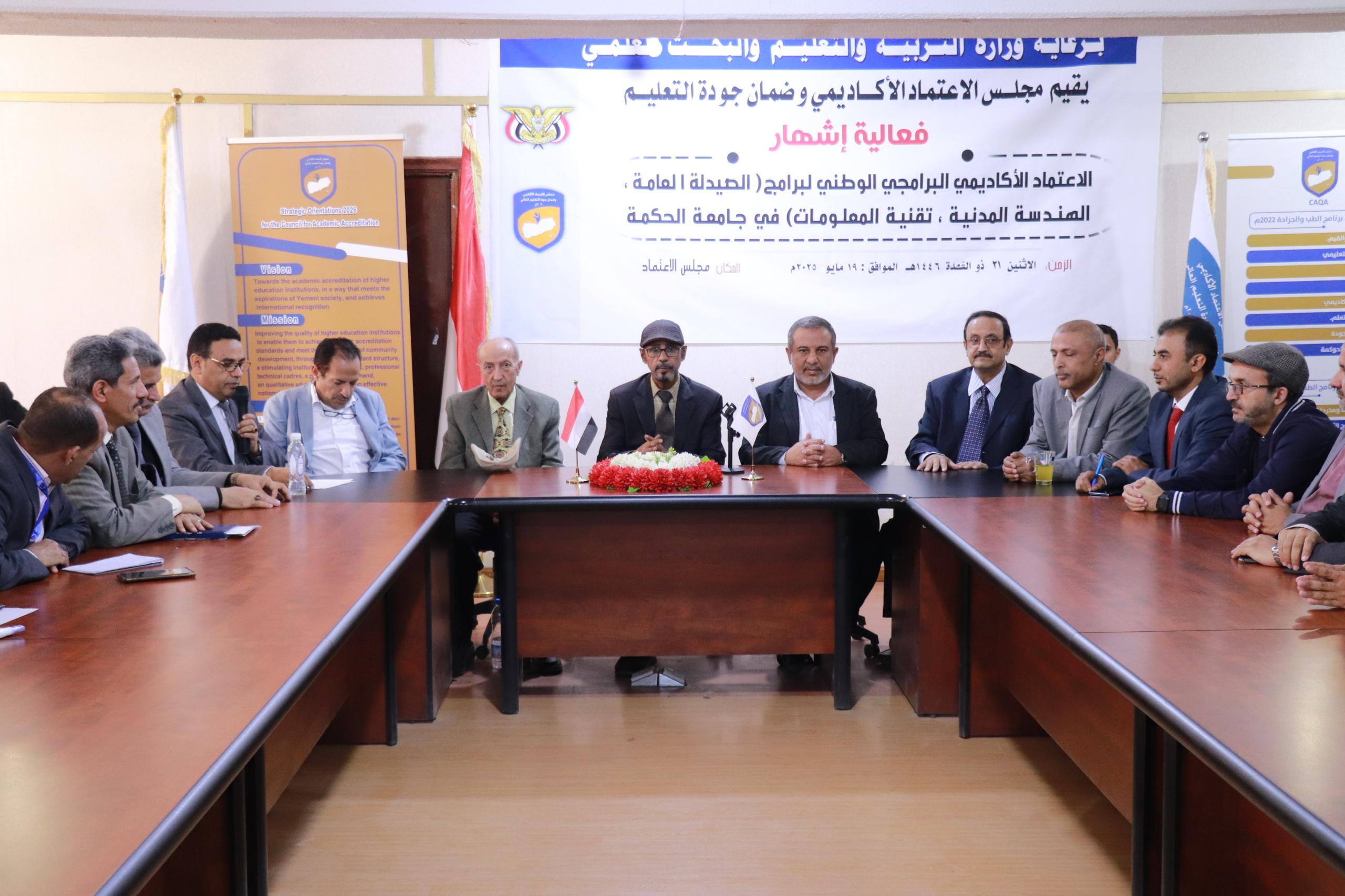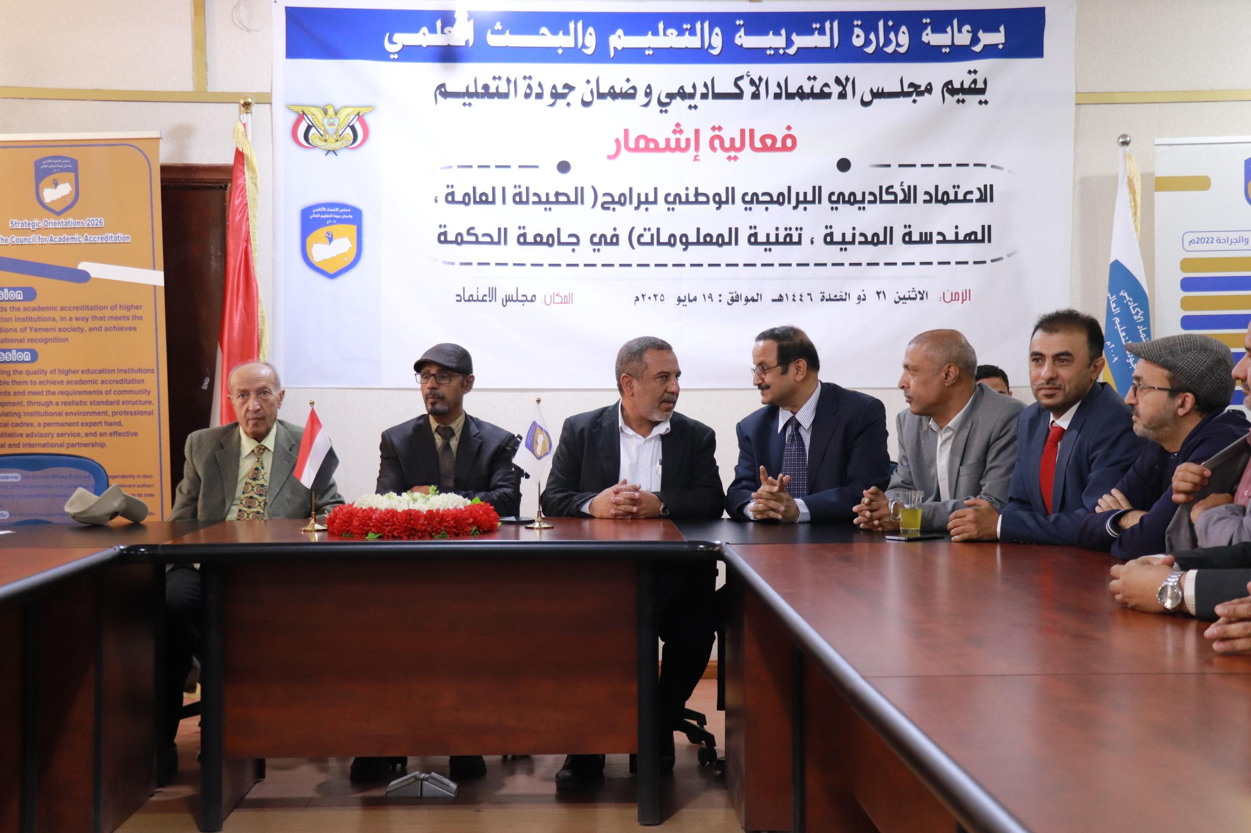 منح مجلس الاعتماد الأكاديمي وضمان الجودة اليوم بصنعاء شهادة الاعتماد الأكاديمي البرامجي الوطني لبرامج "علوم الصيدلة، والهندسة المدنية، وتقنية المعلومات بجامعة الحكمة".