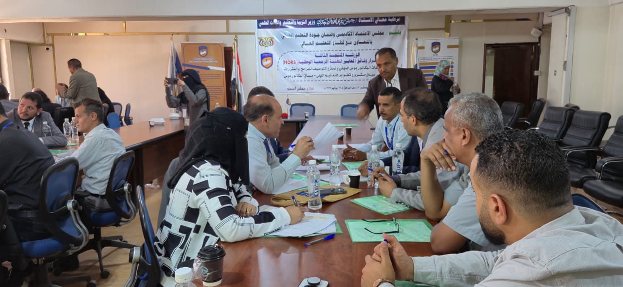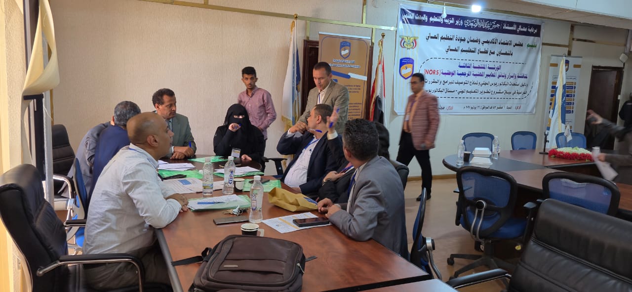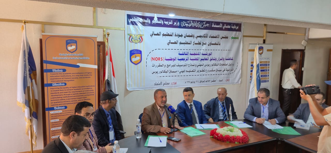 وهدفت الورشة،التي نظمها مجلس الاعتماد الأكاديمي وضمان جودة التعليم العالي بالتعاون مع قطاع التعليم العالي، بمشاركة قيادات الوزارة والمجلس وخبراء الجودة وأكاديميين من مختلف الجامعات وكليات المجتمع اليمنية، إلى مناقشة وإقرار وثائق المعايير المهنية المرجعية الوطنية" الميكاترونكس"، وتقنية المعلومات، ونظم المعلومات المحاسبية، ومراجعة وإقرار دليل نماذج توصيف البرامج الأكاديمية والمقررات الدراسية لمساق البكالوريوس المهني بكليات المجتمع الحكومية والأهلية".