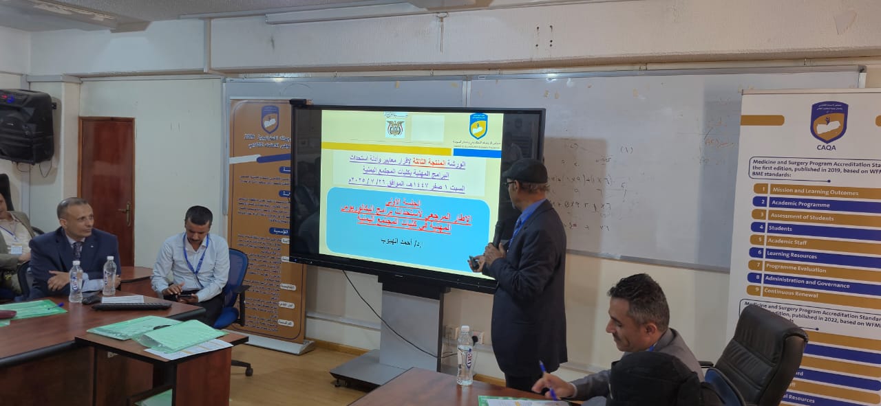 عقدت بصنعاء، اليوم، الورشة المنتجة الثالثة لمناقشة وإقرار وثائق المعايير المهنية المرجعية الوطنية (نورس) ودليل ونماذج توصيف البرامج الأكاديمية والمقررات الدراسية في سياق مشروع تطوير التعليم المهني –مساق البكالوريوس.
